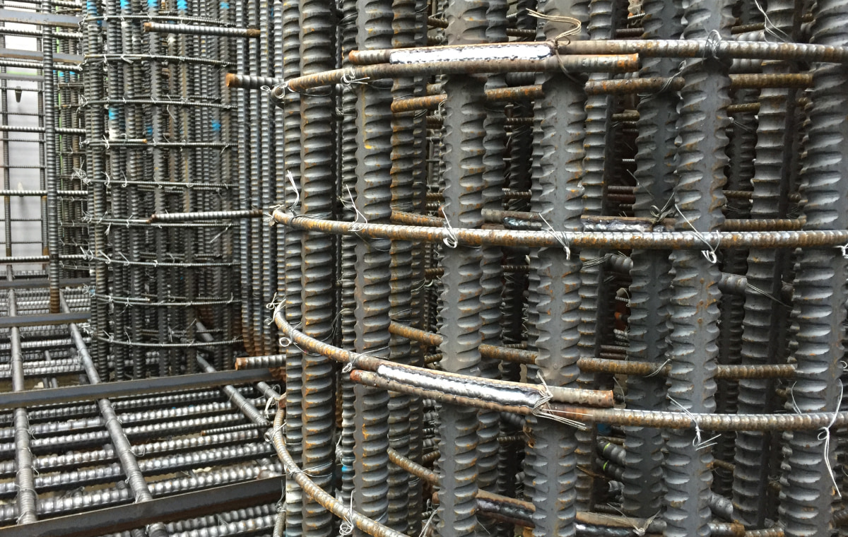 エンクローズ溶接とは、鉄筋同士を継ぐ手段として、圧接、機械式継手と違い、溶接にて鉄筋同士を継ぐ工法です。溶接で継ぐことで、鉄筋同士の引き寄せがないため固定させた鉄筋間での継手施工が可能になります。出来形が鉄筋径とほぼ同径の為、コンクリートのかぶりに影響がないなどで、プレキャストや先組工法に適しています。